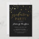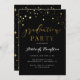 Glam graduation party invitations featuring faux gold foil star confetti and modern typography against a black background. "Graduation Party" is displayed in a chic calligraphy and serif font combination. This invitation reverses to a black background with a gold star pattern. You can easily customise the background colour to suit your needs.