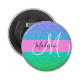 Girly and glam blue, green, aqua and turquoise mermaid glitter sparkles gradient monogram name and initial bottle opener. Your custom name and monogram are written in an elegant hand lettered script with a pink background. A perfect birthday or Christmas gift!