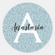 Girly and glam blue silver glitter sparkles monogram name and initial classic round sticker. Personalise with your custom name in an elegant black script and your monogram initial in white. You can change the text colour and font style and size using the customise option.