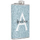Girly and glam blue silver glitter sparkles monogram name and initial flask. Personalise with your custom name in an elegant black script and your monogram initial in white. You can change the text colour and font style and size using the customise option.