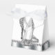 Beautiful black and silver glitter high heel shoe party favour boxes. These elegant black and silver glitter high heel shoe favour boxes can be customised with text and you can change the background colour and bow colour.