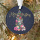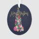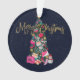 This girly and glamourous Christmas ornament will be the talk of all your friends and family. It's a unique and stylish concept for your holiday papery. It depicts faux gold glitter typography saying, "Merry Christmas." It also features hand-drawn and hand-painted watercolor purses, high heel shoes, faux glitter ornaments, makeup, perfume bottles, wallets, candy canes, gift bag, and gift box. These elements are hung on a green snowy Christmas tree with a gold star topper. The background is a dark navy blue watercolor night sky with flurry snow falling on the ground. On the back is a cute pattern comprised of all the elements together. The colour palette includes bright pinks, blush pinks, coral pinks, black, gold, silver, red, peach, forest green, and white. It's a beautiful, chic, and trendy design for the modern fashionista which is infused with holiday spirit!