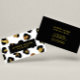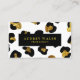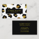 Modern, girly animalier networking card featuring digital image of lepard print in white, black and glitter gold . Black stripe overlay. Great for beauty, fashion , entertainment and event professionals.