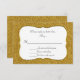 Glamourous wedding response card done in a gold glitter looking background. A decorative gold tone trimmed white text area, in the middle of the card, has black text ready to personalise.