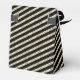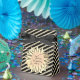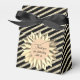 A black and glittery gold striped favour box with a stylish chic golden flower with a gold sphere in the middle where you can personalise your event creating an elegant glittery touch for any occasion.