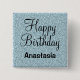 Personalized girly and glam Happy Birthday button with a light blue silver glitter sparkles background and elegant black writing. You can easily add the name of your choice and change the color and font of the name using the customize option!