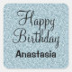 Personalised girly and glam Happy Birthday square sticker with a light blue silver glitter sparkles background and elegant black writing. You can easily add the name of your choice and change the colour and font of the name using the customise option!