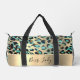Blue and black leopard dots on a shimmery gold backdrop with a gold pearl necklace border where above is a gold shiny edge where you can personalise it with a name, phrase or logo or you can keep it as is with the words "Boss Lady". Chic glam leopard theme.