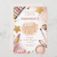 Celebrate in style with this elegant blush pink and gold design featuring makeup brushes, lipstick, glittering stars, and a soft watercolor background. Perfect for a glamourous Sweet 16 celebration full of sparkle and joy.