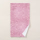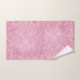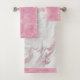 Elegant bath towel set done in pink, white and grey, with a marbled look, on the bath towel, and a pink glittery foil look on the hand towel and wash cloth. Customise to add text to this pretty towel set.