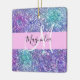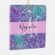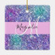 Glam purple, blue and green glitter sparkles monogram name and initial ceramic ornament. Your custom name and monogram are written in an elegant hand lettered script with a light pink background. You can change the text colour and font style and size using the customise option.