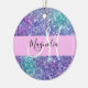 Glam purple, blue and green glitter sparkles monogram name and initial ceramic ornament. Your custom name and monogram are written in an elegant hand lettered script with a light pink background. You can change the text colour and font style and size using the customise option.