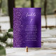 The left-hand edge of this elegant modern wedding table number card features a purple faux glitter border. The word "table" and the table number appear in white handwriting script on a purple faux brushed metal background. Add the names of your guests who are assigned to each table.