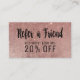 This modern and glamourous faux printed rose gold and glitter mesh gradient, refer a friend discount referral card is perfect for the trendy and stylish business owner. This fashionable and professional looking card is the perfect way to show your customers you care about their business. Customise this card for any business, just edit the text and add your own personal details.