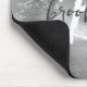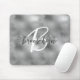 This elegant personalized mouse pad features a monogram and first name in modern charcoal gray and white script on a sparkly background of silver faux foil and glitter.