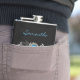 Chic lady's flask done in black, on top, and a turquoise blue, white, and black spotted snow leopard pattern, on the bottom. Graphics of an ornate diamond looking border, with a turquoise blue bauble, runs across the middle of the case bordering the animal pattern. Blue coloured text is ready to personalise, for yourself or as a elegant gift for her.