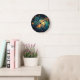 Glam stylish cosmic galaxy clock. Striking wall art Clock in various shapes and sizes. Beautiful world amongst the stars with cool green tones and a warm pop of yellow and orange detail.