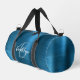 This personalised duffel bag features a monogram and first name in modern turquoise and white script on a glam teal blue faux brushed metal background.