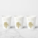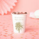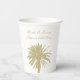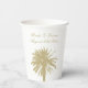 Glamourous beach wedding party supplies custom Paper Cups. Exotic design template with tropical palm tree silhouette. Personalise with names of bride and groom plus date of marriage. Part of beautiful matching theme involving royal table decoration and formal stationery. Beige sand colour palette HEX code #C2B280. Disposable cups for hot and cold drinks.