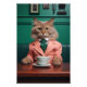 Glamourous bengal cat in a fancy pink suit drinking coffee in a bar