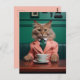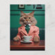 Glamourous bengal cat in a fancy pink suit drinking coffee in a bar