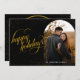 This elegant holiday card features a glamourous design with a touch of sparkle. Your photo is showcased in a beautiful golden arch, set against a rich black background adorned with delicate gold glitter. The "Happy Holidays" greeting is written in a stylish script font, also in gold, adding a touch of elegance and festivity.