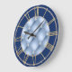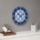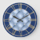 This elegant and glamourous wall clock features a blue and silver theme. The centre portion features a soft blue tufted pattern with diamond accents. The diamonds are tiles across the blue cushion texture. The outer frame is a rich, navy blue colour with silver faux glitter frames. The hours are printed as Roman numerals in a shiny looking, faux gold foil design.