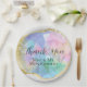 These custom party plates feature an image of a beautiful opal gemstone with a faux gold foil border and accents. The background is a white glitter pattern. The pastel colours appear iridescent. The opal stone are the birthstone for October and are one of the most pretty natural semi precious stones.