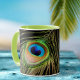 Stylish coffee mug with a glamourous peacock feather over black background.