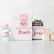 These custom baby shower sticker labels feature a glamourous baby girl theme. An image of a pink baby bottle is pictured with the phrase, "It's a girl" printed in an elegant script font. A pink glitter frame borders the baby bottle. A sample "congratulations" greeting is printed below, followed by a sample name which you can personalise to include your own custom name or text.