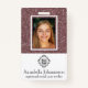This elegant and glamourous custom ID badge features a pink glitter, black, and white design with a sample photo which you can replace with your own photo or image. A sample photo is printed over a faux pink glitter background and a logo is printed below the photo within the solid white area. A name and job title are printed below the logo.