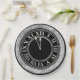 This glamourous custom party plate features a festive New Year's eve theme. A clock with the time at almost midnight is printed in a faux silver foil on a black background. The border features a frame of diamonds pattern.