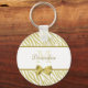 A glamourous designer keychain for women with a white and gold zebra pattern and an elegant gold ribbon tied into a girly bow. Personalise this chic and stylish animal print keyring by adding your name and monogrammed initials. Flat printed image, not actual ribbon.