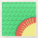 Green background with interlocking curves in darker green, create a look of rolling hills. Lower corner shows yellow sun with rays expanding over red edges pf quarter circle.