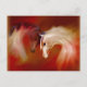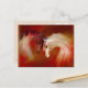 Postcard with original illustration of two horses in sheer tones of white, pink, and brown against a deep red background.