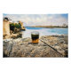 A serene glass of tea on a rugged stone table with a peaceful coastal scene painted in a soft and artistic manner in the background, providing a moment of tranquillity.