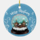 Festive Glass Snowball Winter Village Snowflakes Blue Ceramic Ornament. Fairy tale houses in winter with snow and beautiful snowflakes. Lovely white climbing plants. A Merry Christmas wish in a trendy script. You can change the text.
