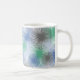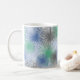 This mug has a mid-century modern design of starbursts in glaucous (blue), grey, light blue, and green.