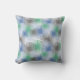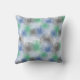 This throw pillow has a mid-century modern design of starbursts in glaucous (blue), grey, light blue, and green.