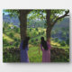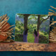 Twin young ladies peer out from behind two trees down into a lush green glen between rocky hills, filled with little farms and hedgerows and stone walls and watered by a sparkling stream that cascades down the hills.