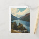 A postcard of Glendalough in Wicklow, Ireland, featuring a serene lake, ancient monastic ruins, and forested hills in the background.