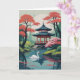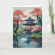 Single swan gliding in front of Asian pavilion surrounded by blossoming trees