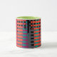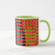 Bold, glitchy, and modern—this eye-catching mug features horizontal bands of fiery red, black, teal, and olive green with a digital distortion twist. The energetic grid pattern feels like a woven tapestry reimagined through a cyberpunk lens. The lime green handle and interior add a fresh, playful pop that contrasts beautifully with the darker, edgy exterior design. A great choice for tech lovers, digital artists, or anyone who thrives on chaotic colour and pattern.