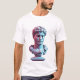 Dive into a retro-futuristic vibe with this unique T-shirt. It features a glitched Roman bust distorted with vibrant effects, surrounded by soft pastel geometric shapes and classic retro