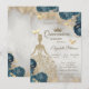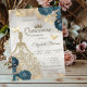 Gold glitter tiara, dress, butterflies, and green roses on a green background. Invite guests to join you in celebrating this milestone with a design that reflects the magic and joy of your quinceañera.