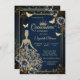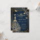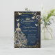 Gold glitter tiara, dress, butterflies, and roses on a navy blue background. Invite guests to join you in celebrating this milestone with a design that reflects the magic and joy of your quinceañera.