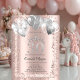 Elegant silver glitter crown, balloons, and frame on rose gold background.