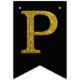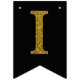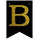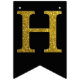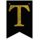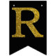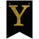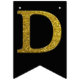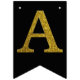 Gold simulated glitter letters set on a solid color. Happy Birthday is accented by flags with diagonal glitter stripes.