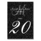This black and white wedding table number card is elegant and sophisticated. The background has a black glitter look, like stars, helping to make this card even more special. Customise with your bride and groom names, newly weds last name, monogram initial and wedding date. A unique card that can also be used as a keepsake. Design by Elke Clarke ©. Printed photo effect glitter design. Order one per table with each table number but still receive the bulk discount for total number ordered. Other colours available on request. (Note: This card contains no messy glitter and is a graphic reproduction print.) See more designs at Zazzle.com/monogramgallery. This signature original design, by Elke Clarke, popular since 2007, is now updated by adding a glitter background photo effect.