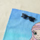 This personalised beach towel has a mermaid with a faux glittered tail combing her hair,  She's set on a shades of blue ocean like background.  Personalise with a name on the bottom.